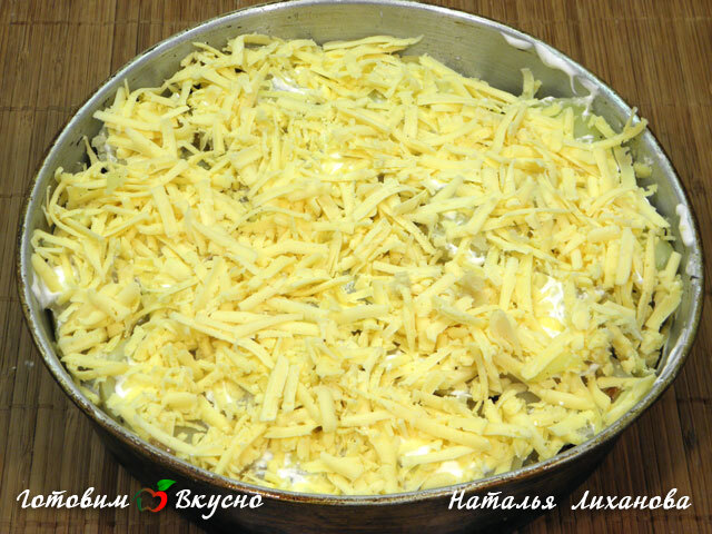 Grease a baking dish with butter, layer half of the potatoes, add a little salt and pepper. Spread sour cream. Then add the mushrooms, season with salt, pepper, and sour cream. Layer the sautéed onions and remaining potatoes, sprinkle with grated cheese on top.