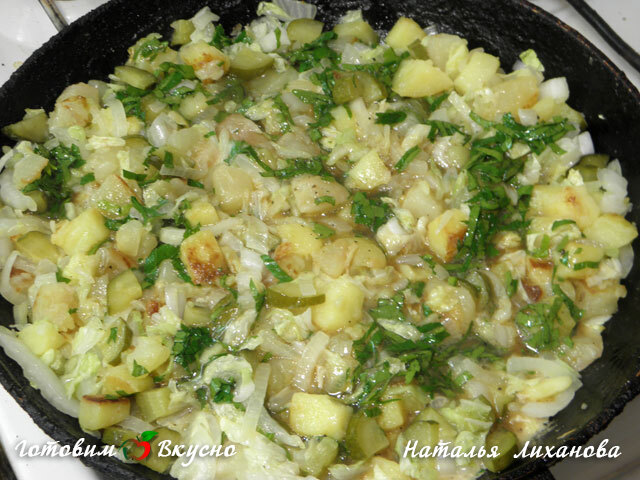 In a separate bowl, mix eggs, chopped parsley, soy sauce, salt, pepper, and sugar. Whisk slightly. Pour the mixture into the skillet, gently shake it to distribute the mixture evenly. Cover and cook over low heat for 8-10 minutes.