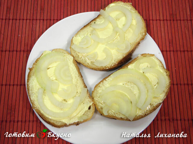 De l'autre côté non doré, étaler du beurre sur chaque morceau et disposer dessus l'oignon coupé en fines demi-rondelles.