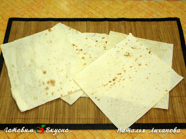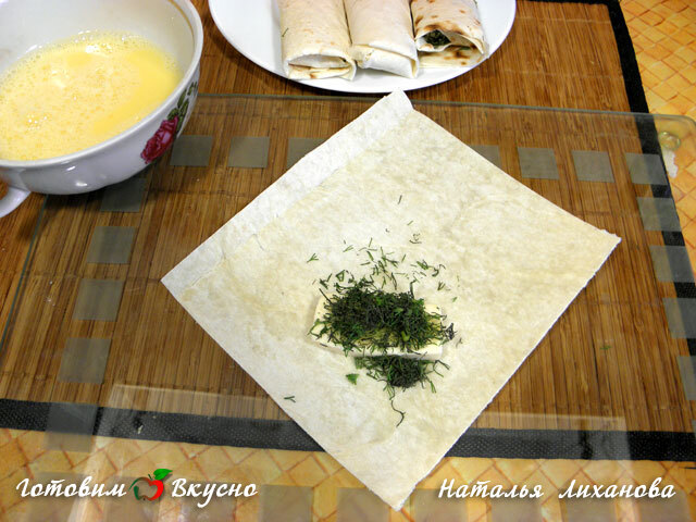 Dans une assiette séparée, battez les oeufs à l'aide d'un fouet. Sur chaque carré de lavash, placez un morceau de fromage fondu, de l'ail par-dessus et saupoudrez d'aneth. Enroulez le lavash en forme de rouleau.