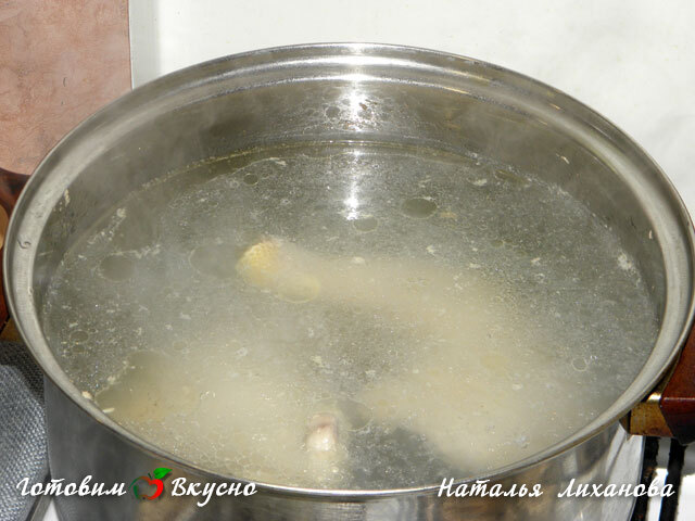Pour préparer le chihirtma, coupez le poulet en 4 morceaux, versez 3 litres d'eau, salez et faites cuire jusqu'à ce qu'il soit prêt. Ensuite, retirez le poulet, séparez la viande des os. Filtrez le bouillon.