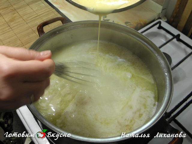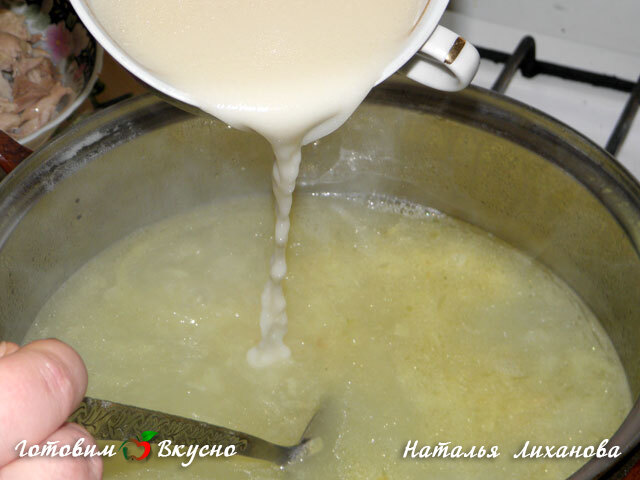 Versez deux louches de bouillon dans un bol séparé et laissez refroidir un peu. Délayez la farine dans le bouillon pour obtenir une masse liquide homogène. Versez la masse dans la casserole, en remuant constamment, et portez à ébullition.
