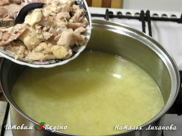 Coupez la viande de poulet en petits morceaux et ajoutez-la au bouillon. Salez, ajoutez les épices selon votre goût.