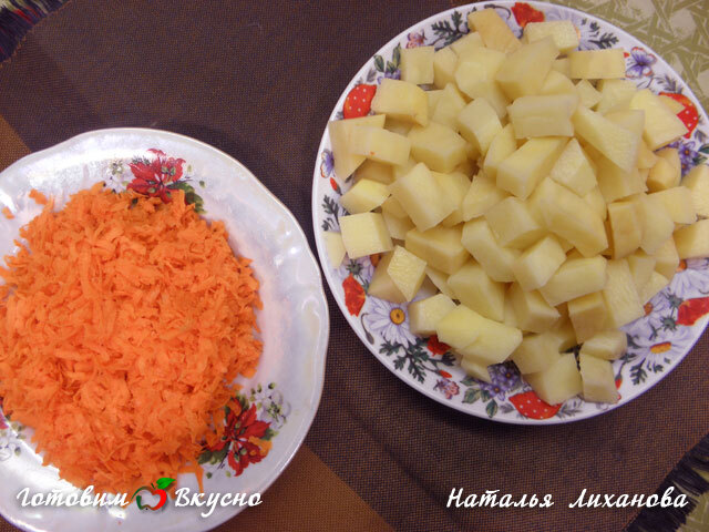 Éplucher les pommes de terre et les carottes. Couper les pommes de terre en cubes et râper les carottes. Une fois les pois cuits, ajouter les pommes de terre et les carottes dans le bouillon, retirer l'oignon, qui ne sera plus nécessaire. Ajouter les feuilles de laurier, le sel et le poivre noir.