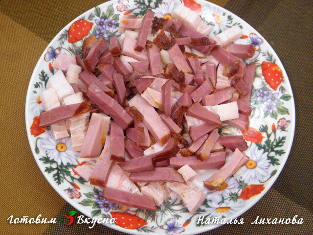Couper la poitrine en lanières et faire dorer dans l'huile jusqu'à ce qu'elle soit dorée. Après la cuisson des pommes de terre, ajouter la poitrine dorée dans le bouillon. Ajouter également les herbes. Porter à ébullition et retirer du feu.