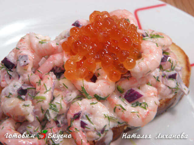 Recette festive d'amuse-gueule - crevettes sur toasts avec du caviar rouge. Ce plat sera un excellent amuse-gueule pour n'importe quelle fête. La combinaison des crevettes acidulées et salées avec du caviar rouge est parfaite. Avec cet amuse-gueule, votre fête sera tout simplement élégante.