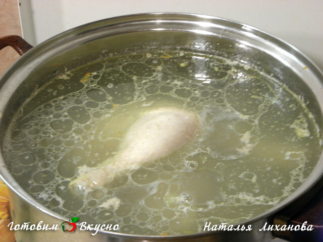 Pour préparer la soupe de poulet aux nouilles avec des champignons, commençons par préparer le bouillon. Versez de l'eau (3-3,5 litres) sur le poulet et attendez qu'elle bout. Ensuite, ajoutez une feuille de laurier, du poivre de Jamaïque. Laissez cuire encore 40 minutes. Ensuite, retirez le poulet, coupez-le en morceaux et passez le bouillon au tamis.