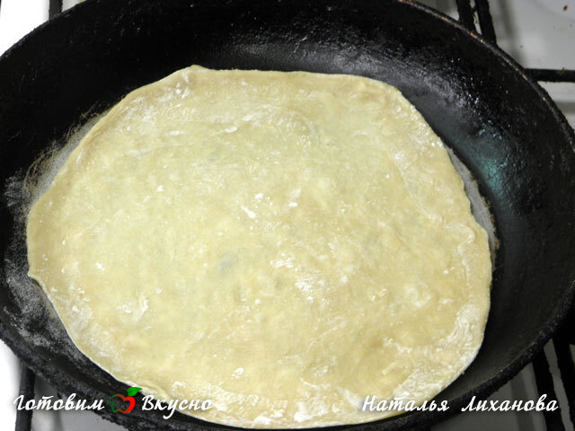 Couvrez la pâte et laissez reposer pendant 20 minutes. Ensuite, séparez de petits morceaux de la pâte et étalez-les finement en forme de cercle d'environ le diamètre de la poêle pour les sécher. Mettez la poêle sur feu doux, placez nos galettes, retournez-les, retirez-les. Elles sèchent très rapidement, environ 0,5 minute de chaque côté.