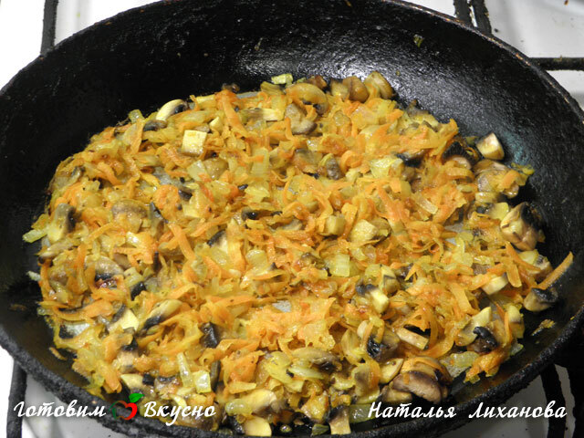 Faisons maintenant une garniture pour la soupe. Faites revenir un peu d'oignon avec des carottes, ajoutez les champignons tranchés, faites revenir le tout un peu plus et mettez de côté.
