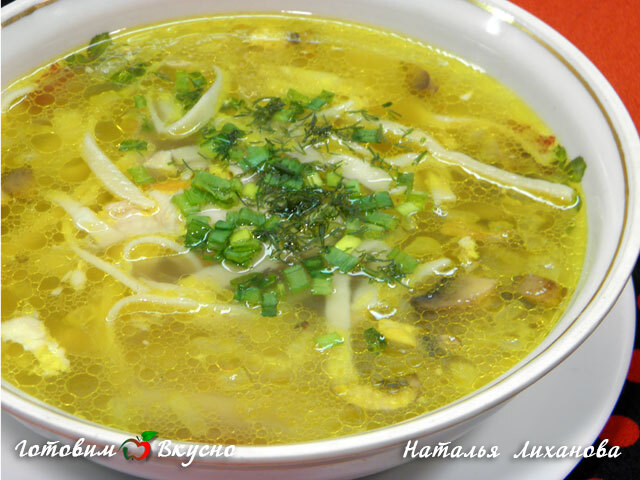 Versez les nouilles dans le bouillon bouillant, laissez cuire 3-4 minutes, ajoutez la garniture, le poulet coupé, du sel et du poivre. Laissez mijoter un peu plus (2-3 minutes), puis éteignez.