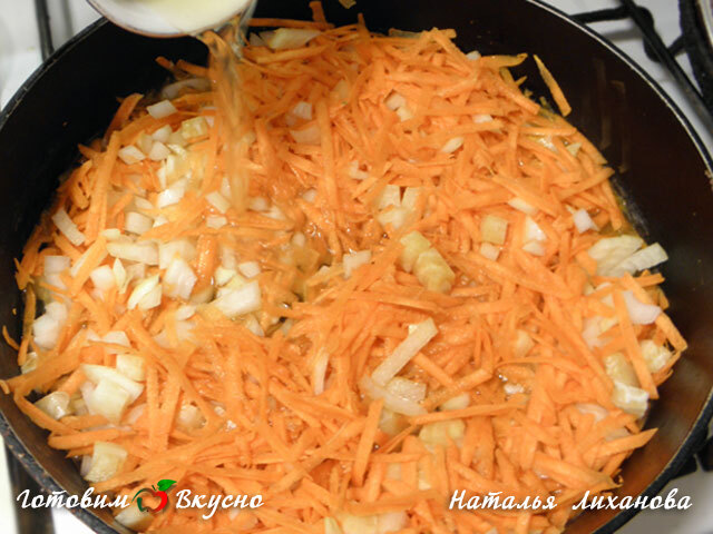 Éplucher finement les oignons, les carottes, le céleri, les hacher ou les râper grossièrement. Mettre les légumes préparés dans une poêle chaude avec de l'huile végétale, ajouter du bouillon de foie et laisser mijoter à feu moyen pendant 10 minutes. Ensuite, ajouter le gingembre coupé en petits morceaux, du sel et du poivre selon votre goût. Laisser mijoter encore 5 minutes, puis mettre sur une assiette et laisser refroidir un peu.