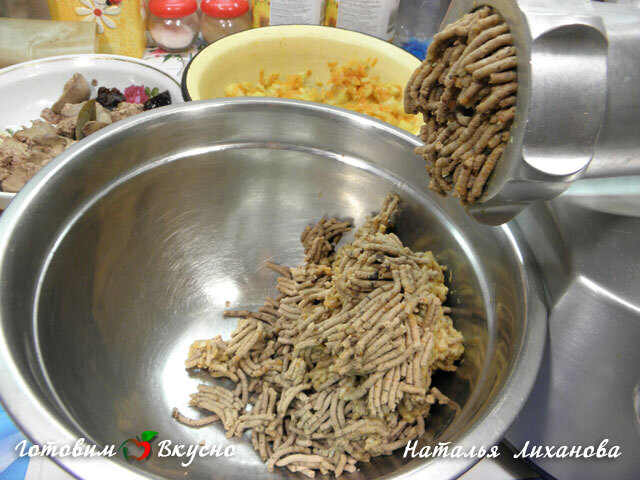 Passer le foie, les légumes et les pruneaux préalablement trempés dans l'eau bouillante à travers un hachoir à viande, en ajoutant progressivement de petites portions.