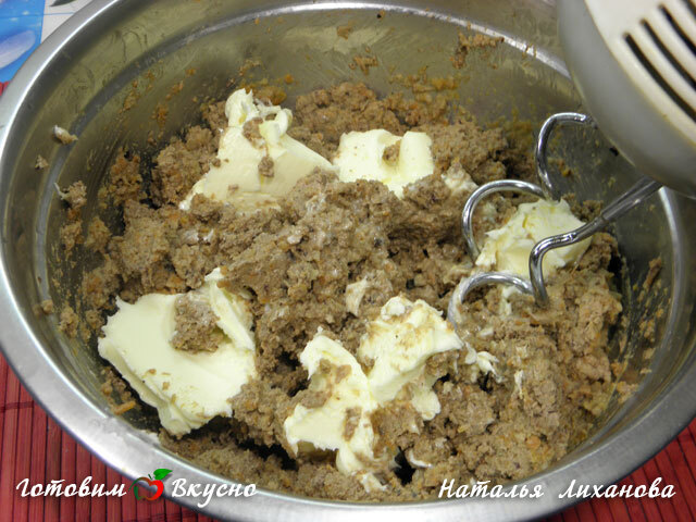 Ajouter ensuite le beurre ramolli et mélanger soigneusement, à l'aide d'une spatule ou d'un mixeur avec des embouts pour la pâte.