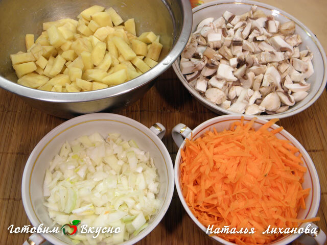 Coupez l'oignon en petits cubes, râpez la carotte en gros morceaux, coupez les pommes de terre et les champignons en petits cubes.