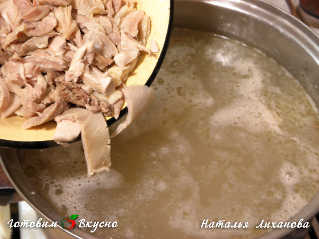 Une fois la viande cuite, retirez-la du bouillon, enlevez les os et coupez-la en petits morceaux. Remettez la viande dans le bouillon, ajoutez les pommes de terre et le sarrasin. Laissez mijoter la soupe jusqu'à ce que les pommes de terre soient cuites (15-20 minutes).