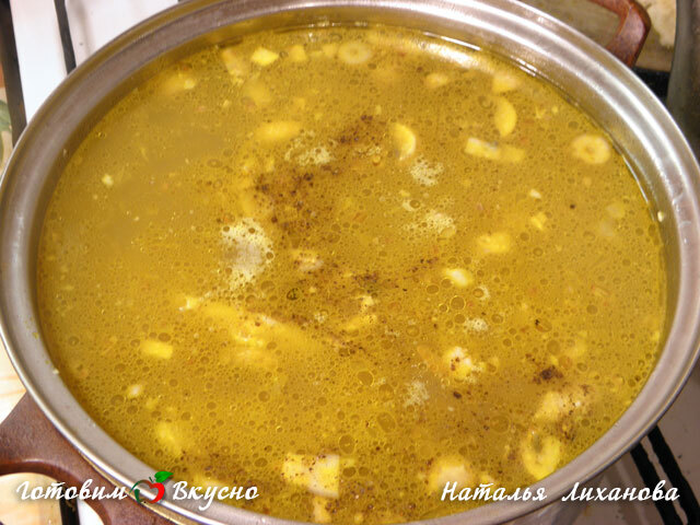 Une fois les pommes de terre cuites, ajoutez la garniture dorée à la soupe de sarrasin, assaisonnez de sel et de poivre noir moulu selon votre goût.