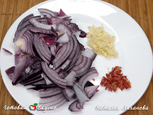 Couper finement l'ail et le piment, émincer l'oignon rouge en fines demi-tranches.