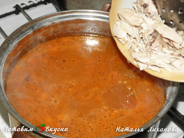 Passer le bouillon cuit au tamis, retirer la viande de l'os et la couper en petits morceaux. Ajouter les tomates avec l'oignon, l'ail et le piment au bouillon.