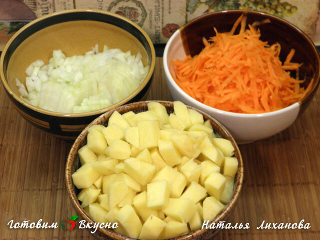 Coupez les pommes de terre en cubes, hachez l'oignon en petits dés et râpez les carottes.
