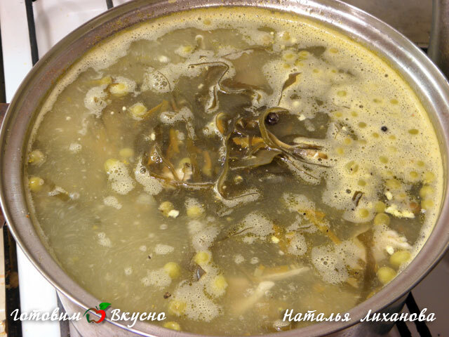 Une fois les pommes de terre cuites, ajoutez les algues (sans le liquide), les petits pois (également sans le liquide), l'œuf râpé fin et la viande coupée. Laissez mijoter encore 3 minutes, salez et poivrez.