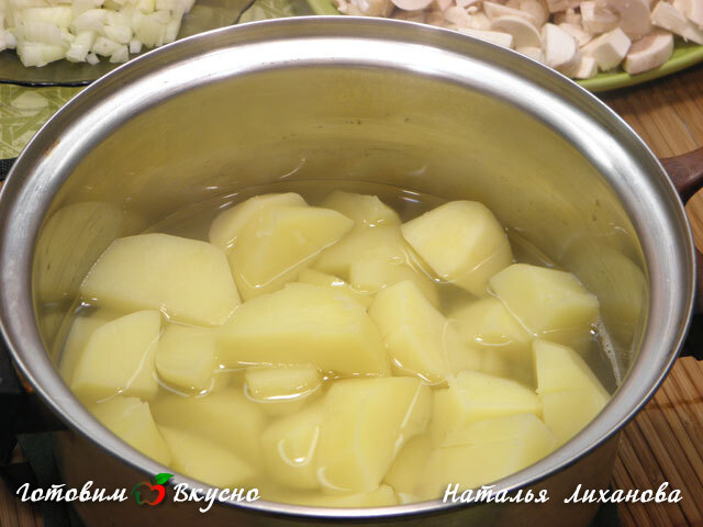 Pour préparer le potage aux champignons, éplucher et couper les pommes de terre en morceaux. Les couvrir d'eau, saler et cuire jusqu'à ce qu'elles soient tendres.