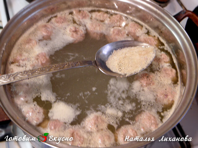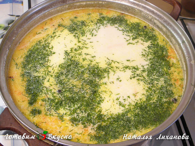 Soupe au fromage avec des boulettes de viande, saler selon votre goût, ajouter des herbes, laisser mijoter un peu plus, puis éteindre le feu. La soupe parfumée et très délicieuse est prête!