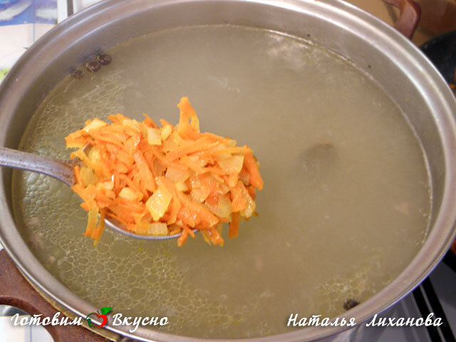 Préparer la garniture. Hacher finement l'oignon, râper la carotte moyennement. Faire revenir les légumes préparés dans de l'huile végétale jusqu'à ce qu'ils soient tendres. Ajouter la garniture à la soupe.