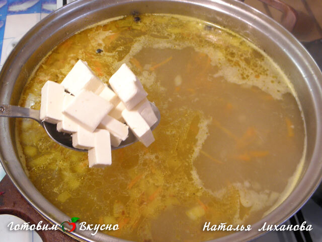 Ajouter le fromage coupé en dés dans la soupe, remuer constamment pour que le fromage fonde uniformément.