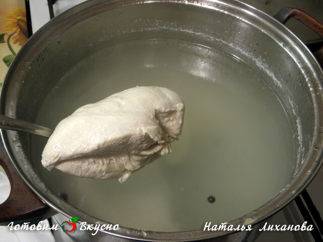 Pour préparer la soupe au fromage avec du riz, versez 3 litres d'eau sur les filets de poulet, salez, poivrez et faites cuire jusqu'à ce qu'ils soient cuits (25-30 minutes après ébullition). Retirez la viande prête du bouillon.