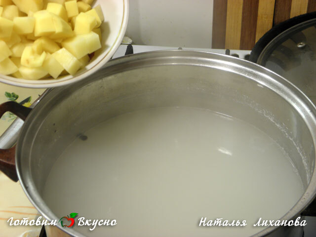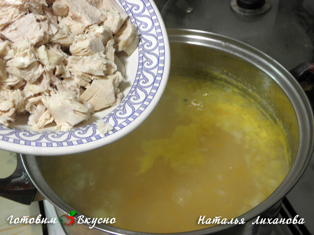 Ajoutez la viande coupée en petits morceaux et faites cuire la soupe jusqu'à ce que les pommes de terre soient cuites.