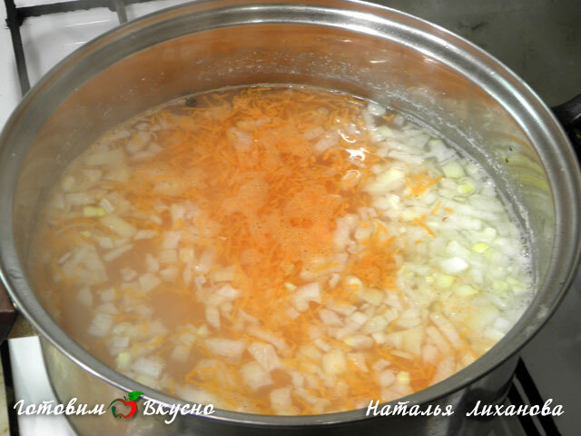 Hachez finement l'oignon et râpez la carotte moyenne. Faites cuire le tout pendant 5-7 minutes.