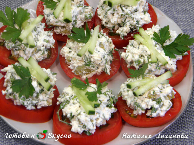 Coupez les tomates en rondelles et disposez la masse de fromage blanc obtenue dessus. Décorez avec des rondelles de concombre et des herbes. L' Apéritif au fromage blanc est prêt!