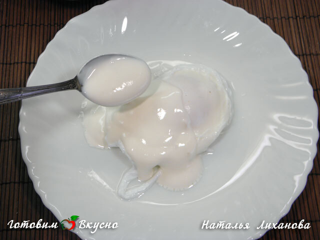 Disponiamo le uova su un piatto usando un mestolo forato e versiamo lo yogurt sopra.