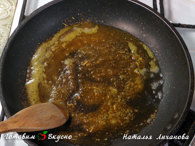 In una padella, facciamo sciogliere il burro, quando inizia a fare le bolle, aggiungiamo paprica, pepe. Aggiungo un po' di erbe aromatiche italiane secche (a piacere). Mescoliamo.