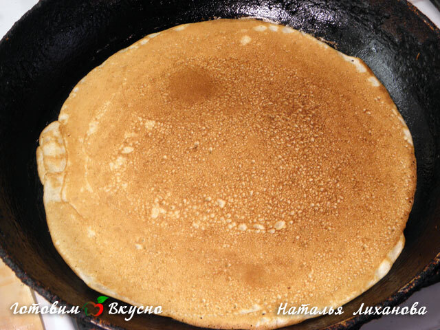 Печем блины на хорошо разогретой сковороде, каждый раз смазывая ее растительным маслом.