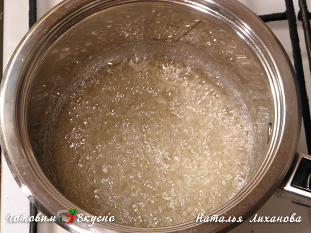 Чтобы приготовить белковый заварной крем, в первую очередь поставим вариться сироп. В отдельную кастрюльку засыпаем сахар и добавляем воду. Ставим на огонь и ждем пока закипит. Как только сироп закипел уменьшаем огонь и варим его 5-7 мин. Кипятим сироп на маленьком огне, от сильного кипения (огня) сахар начнет желтеть, а нам нужен прозрачный сироп, чтобы потом крем был белоснежным.