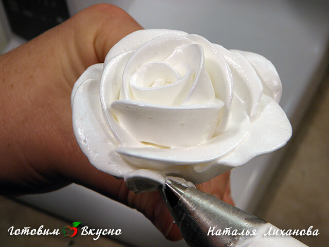 Из этого крема можно делать розочки, хризантемы.Белковый заварной крем используют для украшения тортов, капкейков, пирожных. Он легче и воздушней чем белково - масляный крем. Крем можно подкрашивать сухими или гелиевыми красителями