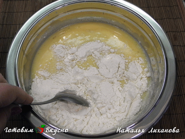 Вливаем в массу слегка взбитые яйца и растопленный (не горячий) маргарин. Перемешиваем засыпаем просеянную муку, еще перемешиваем.