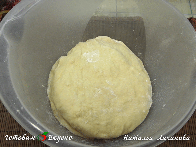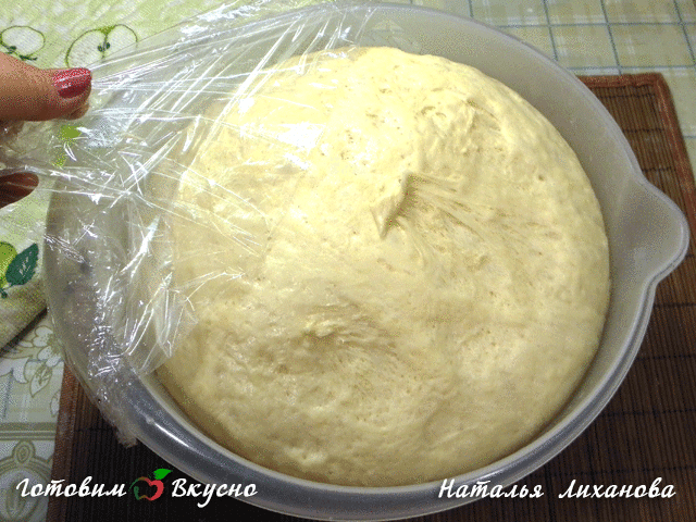 Полученное тесто кладем в большую миску, закрываем его пленкой или крышкой и ставим в теплое место примерно на 1 час, чтобы оно подошло.