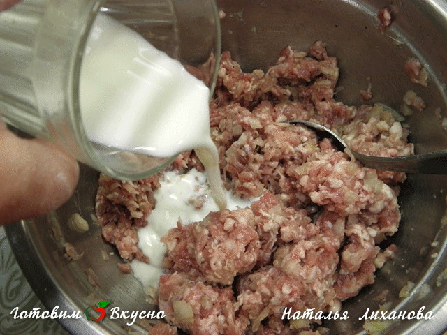 Приготовим начинку для беляшей. В фарш добавляем мелкорубленый лук (можно использовать блендер или мясорубку). Добавляем соль, перец и сливки (молоко или воду). Начинку тщательно перемешиваем.