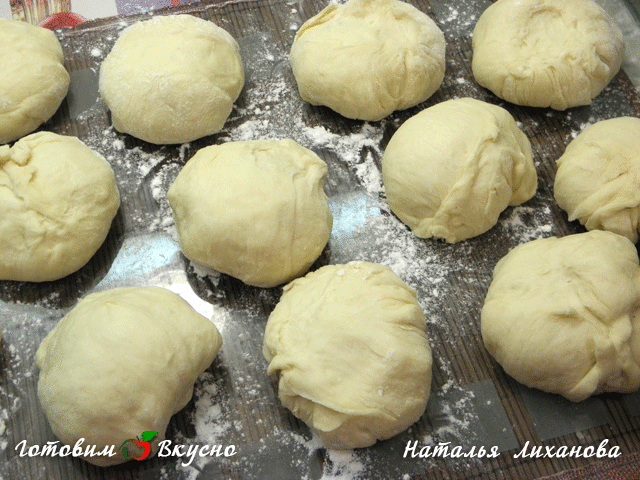 После того как тесто второй раз подошло делим его на шарики одинаковой величины (примерно 45-50 г)