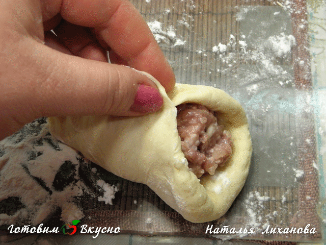 Далее каждый шарик расправляем в кружок на середину кладем фарш и соединяем вместе края сначала в форме вареника.