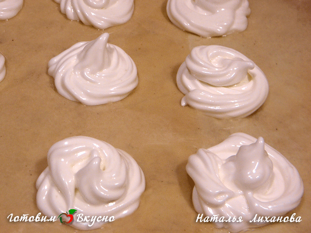 Застилаем противень бумагой для выпечки. При помощи кулинарного мешка или просто ложкой выкладываем безе и ставим в духовку, нагретую до 100-110 градусов. Для «подсушивания» безе понадобится от 1 до 3 часов в зависимости от величины безе.
