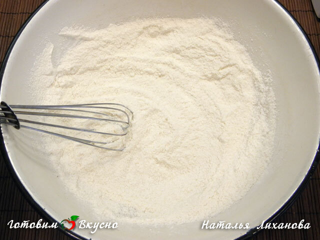 Во взбитые белки засыпаем смесь муки, соли и сахара. При помощи лопатки аккуратно и быстро перемешиваем сверху- вниз.