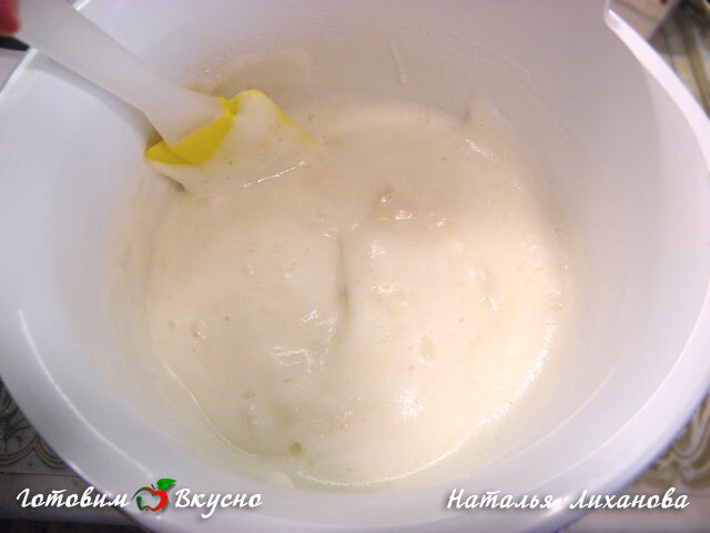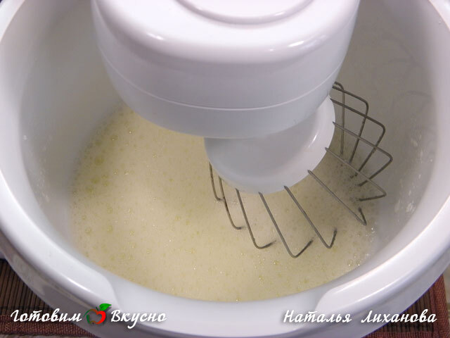 В белки добавляем лимонный сок и взбиваем до образования легкой пышной пены.