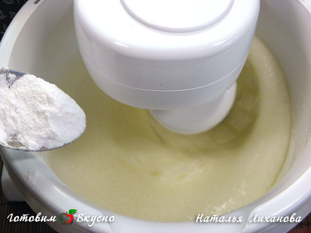 Не прекращая взбивания, частями, добавляем оставшуюся сахарную пудру и взбиваем белки до средней пены.