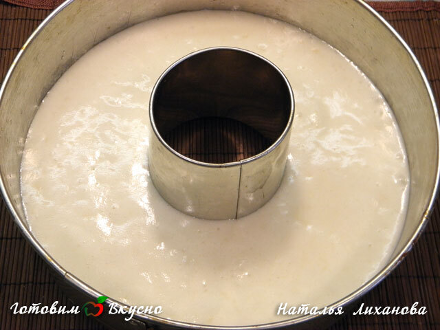 Берем форму (в виде кольца с отверстием посередине) немного сбрызгиваем водой и выкладываем тесто, поверхность разравниваем.