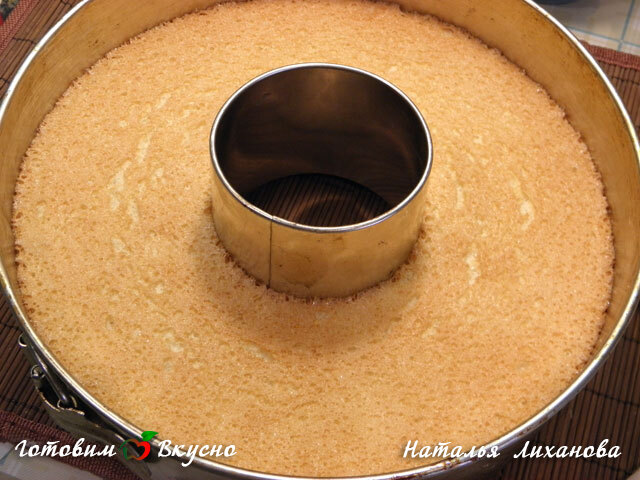 Форму с бисквитом вынимаем из духовки переворачиваем на решетку или перевернутую форму одеваем на бутылку с высоким горлышком, полностью остужаем.Теперь ножом проводим вдоль стенок открываем форму и достаем бисквит.