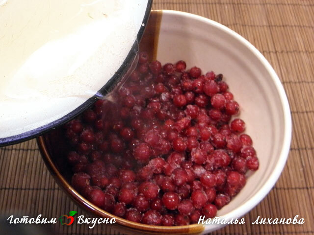 Из сахара и воды готовим сироп (доводим до кипения). Складываем ягоды (у меня свежемороженая красная смородина) в глубокую миску. Заливаем сиропом ягоды. Добавляем ликер и оставляем настаиваться.