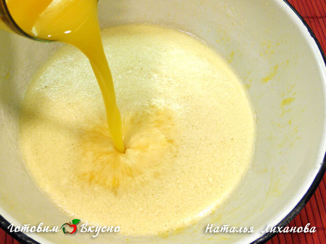 Для приготовления апельсиновых блинчиков, яйца взбиваем с сахаром. Добавляем маргарин, щепотку соли и вливаем апельсиновый сок. Тщательно перемешиваем.